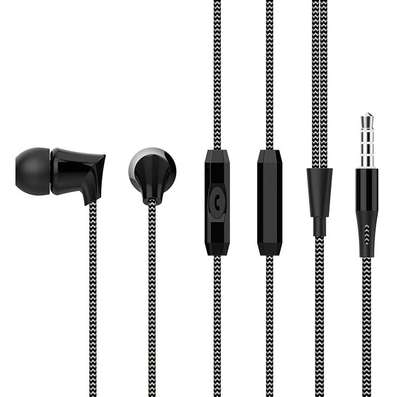 Snowam wired earphone housing made of ABS material and cable made of braided/fabric material. Built-in line remote contorl for music and calls. Material compliant with CE, RoHs, Reach, FCC &  California Prop  65 etc.